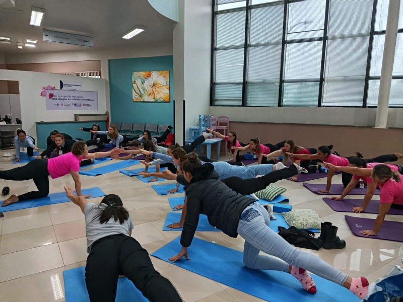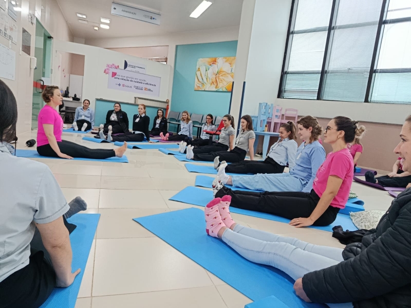 No dia 17, a professora e paciente do HRTGB-Santé, Adriane Dal Bosco, ministrou aula de Ioga com colaboradores da unidade. Anteriormente, ela já havia desenvolvido a ação no Setor de Oncologia, envolvendo paciente e acompanhantes.